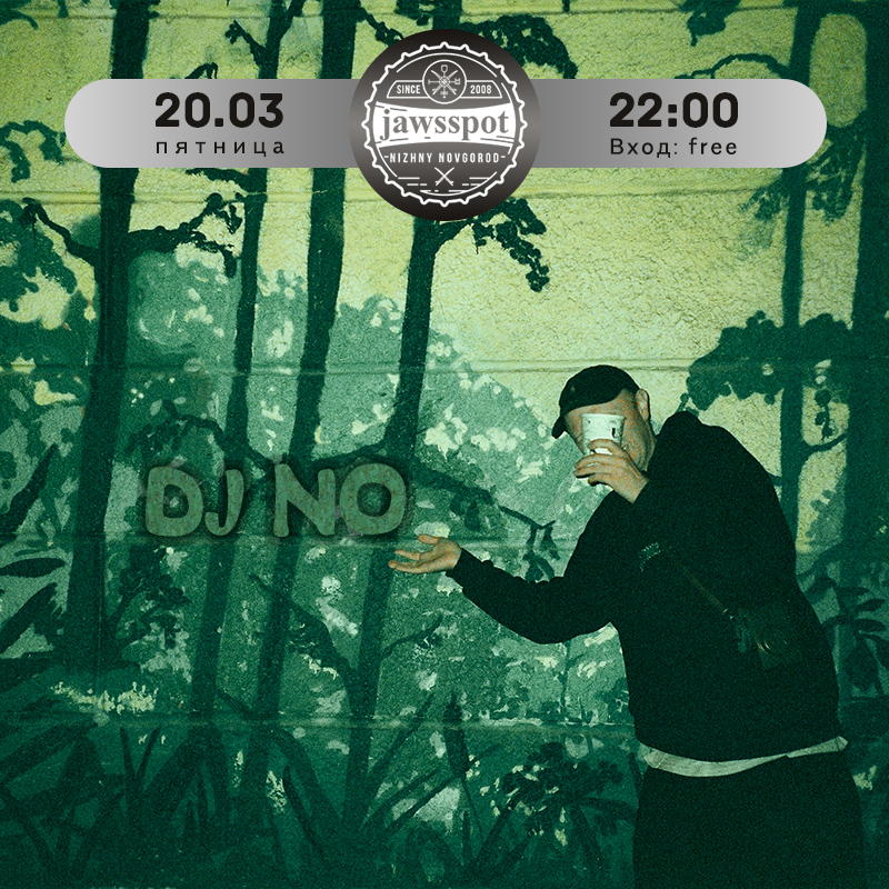 DJ No — музыкант, диджей, дизайнер участник VOLNA, ALL NIGHT. С лайвами с сетами побывал во многих городах России: Москва, Санкт-Петербург, Владимир, Казань, Челябинск, Самара, Екатеренбург. В родном городе играет на многих значимых мероприятиях и вечеринках, на граффити и скейт контестах. А сегодня делает лайв в нашем Jawsspotnn, приходите!